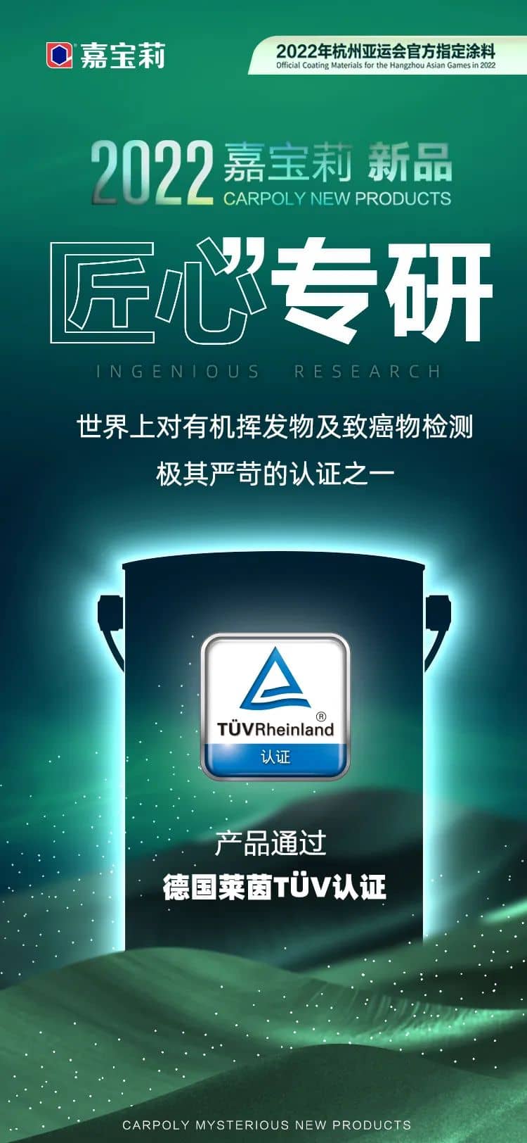 德國萊茵TÜV集團是全球最大的第三方檢測認證機構之一,該認證重點關注安全、質量和性能等指標,對氣味、TVOC含量以各組份限制嚴格要求。同時,德國萊茵TÜV認證會對工廠開展實地審查及產品動態抽檢監督。獲得該認證是也體現了嘉寶莉致力于為消費者提供安全、健康、優質產品的決心。
