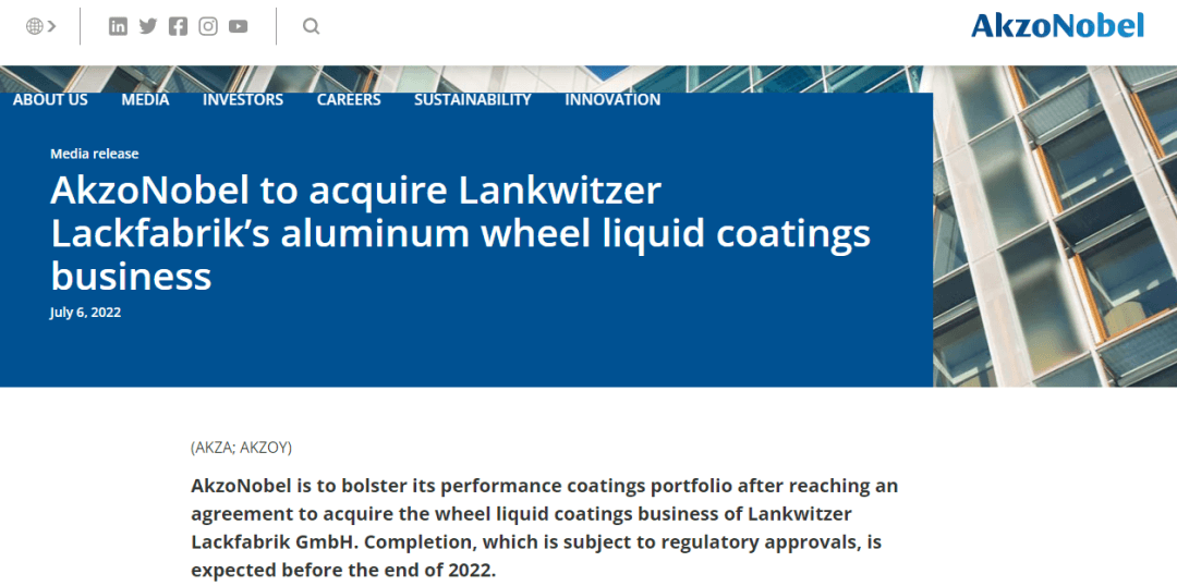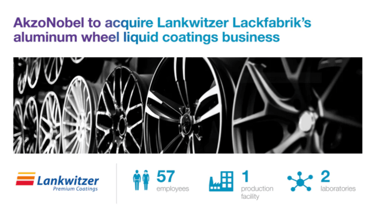 近日,阿克蘇諾貝爾官網宣布,在達成協議收購 Lankwitzer Lackfabrik GmbH 的車輪液體涂料業務后,將加強其高性能涂料產品組合。Lankwitzer的業務在德國萊比錫的一個制造基地運營,其產品被戴姆勒、奧迪、大眾、歐寶、菲亞特和雷諾等汽車制造商批準使用。