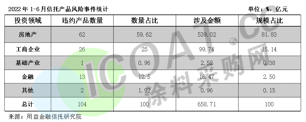 從2021年五月份以來,房地產(chǎn)就一直是信托產(chǎn)品風險事件的高發(fā)領域。數(shù)據(jù)顯示,2022年1-6月信托產(chǎn)品違約規(guī)模總計658.71億元,違約產(chǎn)品數(shù)量共104起。房地產(chǎn)信托違約金額達539.02億元,規(guī)模占比達到81.83%。