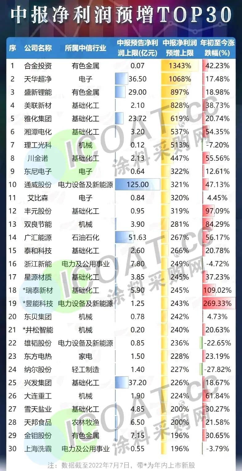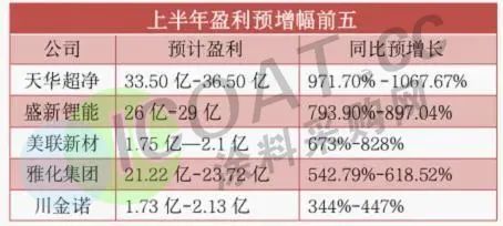 中報(bào)凈利潤預(yù)增幅度TOP30榜單顯示,有色金屬行業(yè)的合金投資、電子行業(yè)的天華超凈凈利潤預(yù)增超過1000%,最高預(yù)增超1300%!基礎(chǔ)化工行業(yè)的美聯(lián)新材、雅化集團(tuán)、川金諾、豐元股份、廣匯能源、泰和科技、星源材質(zhì)、瑞泰新材、興發(fā)集團(tuán)、雪天鹽業(yè)等榮耀上榜。
