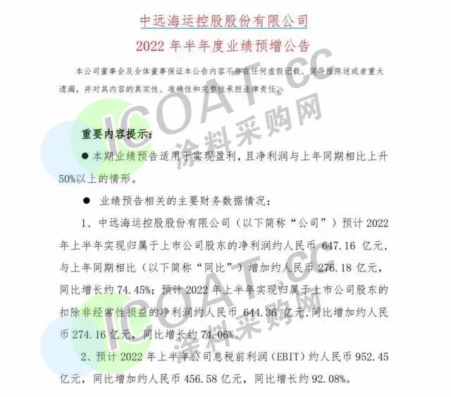 除了預(yù)增比例之外,網(wǎng)友和投資者更為關(guān)注的是,這些企業(yè)究竟賺了多少錢。據(jù)涂料采購網(wǎng)不完全統(tǒng)計(jì),中遠(yuǎn)海控預(yù)計(jì)2022年上半年實(shí)現(xiàn)歸屬于上市公司股東的凈利潤約647.16億元,同比增加約276.18億元,同比增長約74.45%,位居凈利潤業(yè)績預(yù)增榜榜首。對(duì)于業(yè)績預(yù)增的原因,中遠(yuǎn)海控表示,2022年上半年,國際集裝箱運(yùn)輸供求關(guān)系較為緊張,主干航線出口運(yùn)價(jià)保持高位運(yùn)行。