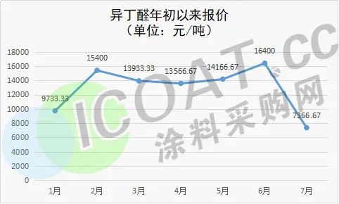 近日,價(jià)格持續(xù)沖高的異丁醛走出了大反轉(zhuǎn)行情,連續(xù)4周跌價(jià)后,目前報(bào)價(jià)7366.67元/噸,較年初價(jià)格下跌了6833.33元/噸,跌幅近50%。異丁醛價(jià)格探底來勢兇猛,且已經(jīng)跌破了7500元/噸的成本線,極其罕見。