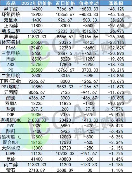 部分化工品年初以來跌幅榜