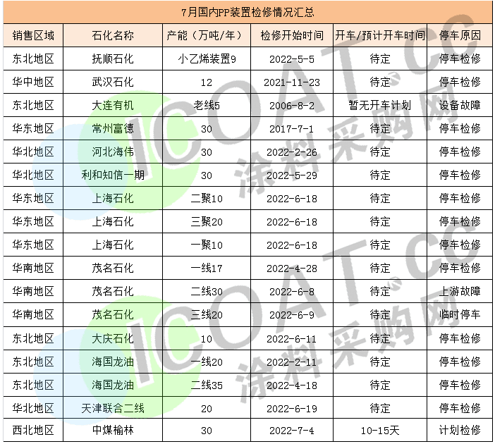 PP行業,上半年裝置檢修數量明顯增加,其中不少企業的檢修計劃貫穿了7月,或開車重啟時間待定。其中中煤榆林計劃從7月初開始檢修為期10-15天,東北、華東、華南等多個區域目前開車時間待定。