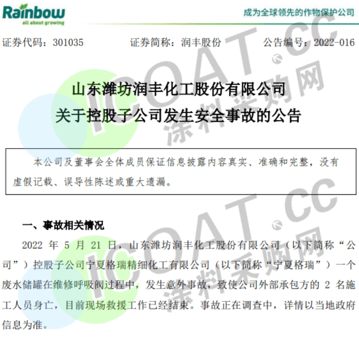 5月21日,山東濰坊潤豐化工控股子公司寧夏格瑞精細化工一個廢水儲罐在維修呼吸閥過程中,發生意外事故,致使企業外部承包方的2名施工人員身亡。
