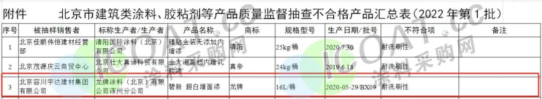 抽查結(jié)果公示中,“龍牌漆”被曝不合格的產(chǎn)品是“墻面漆”、商標(biāo)為“龍牌”、標(biāo)稱生產(chǎn)者為“龍牌涂料(北京)有限公司涿州分公司”、規(guī)格型號為“16L/桶”、生產(chǎn)日期/批號為“2020-05-29/BX09”、產(chǎn)品名稱為“碧新超白墻面漆”、不合格項(xiàng)目為“耐洗刷性”。
