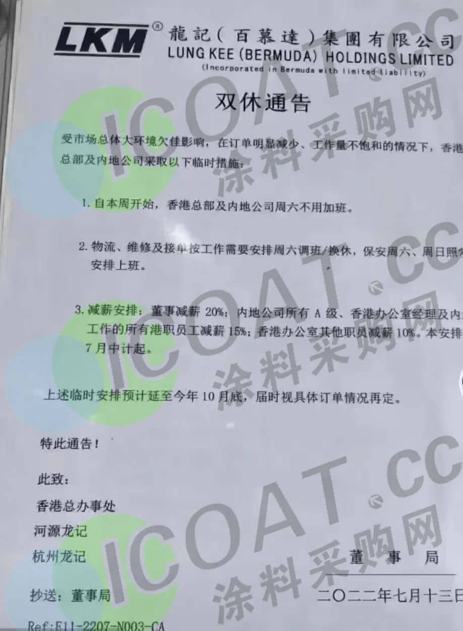 龍記(百慕達)集團:受市場總體大環境欠佳影響,在訂單明顯減少、工作量不飽和的情況下,香港總部及內地公司采取以下臨時措施。自本周開始,香港總部及內地公司周六不用加班;物流、維修及按單工作需要安排周六調班/換休;董事減薪20%,內地公司所有A級、香港辦公室經理及內地工作的所有港職員工減薪15%,香港辦公室其他職業減薪10%,本安排自7月中計起,預計延至今年10月底。