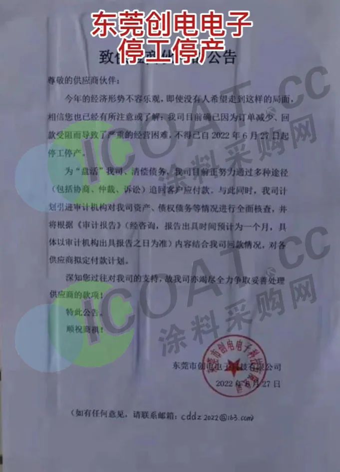 東莞創電電子:目前因為訂單減少、回款受阻導致嚴重的經營困難,不得已自6月27日起停工停產,企業計劃引進審計機構對資產、債權債務等情況進行全面核查,并將根據《審計報告》內容結合回款情況,對個供應商擬定付款計劃。