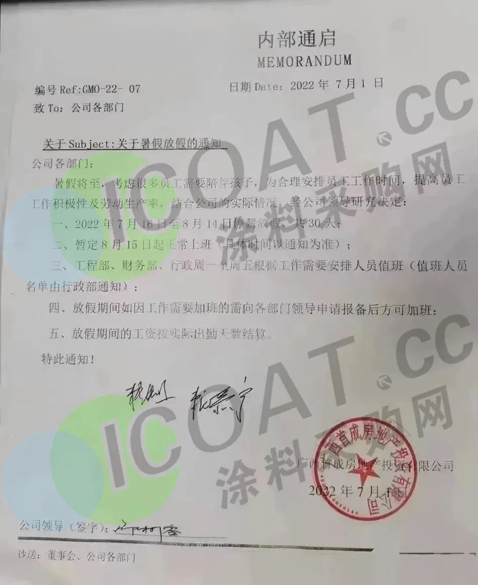 廣東首成房地產投資:經研究決定,2022年7月16日至8月14日停薪放假共30天,暫定8月15日起正常上班(具體時間以通知為準)。