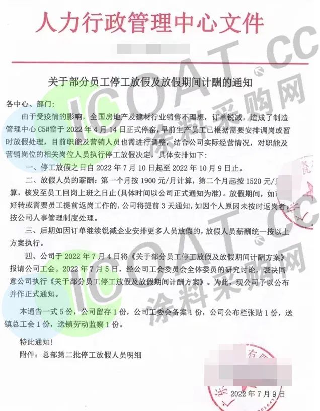 廣東某企業通知,由于受疫情影響,全國房地產及建材行業銷售不理想,訂單銳減,企業結合實際經營情況,對職能及營銷崗位的相關崗位人員,自2022年7月10日至10月9日停工放假。