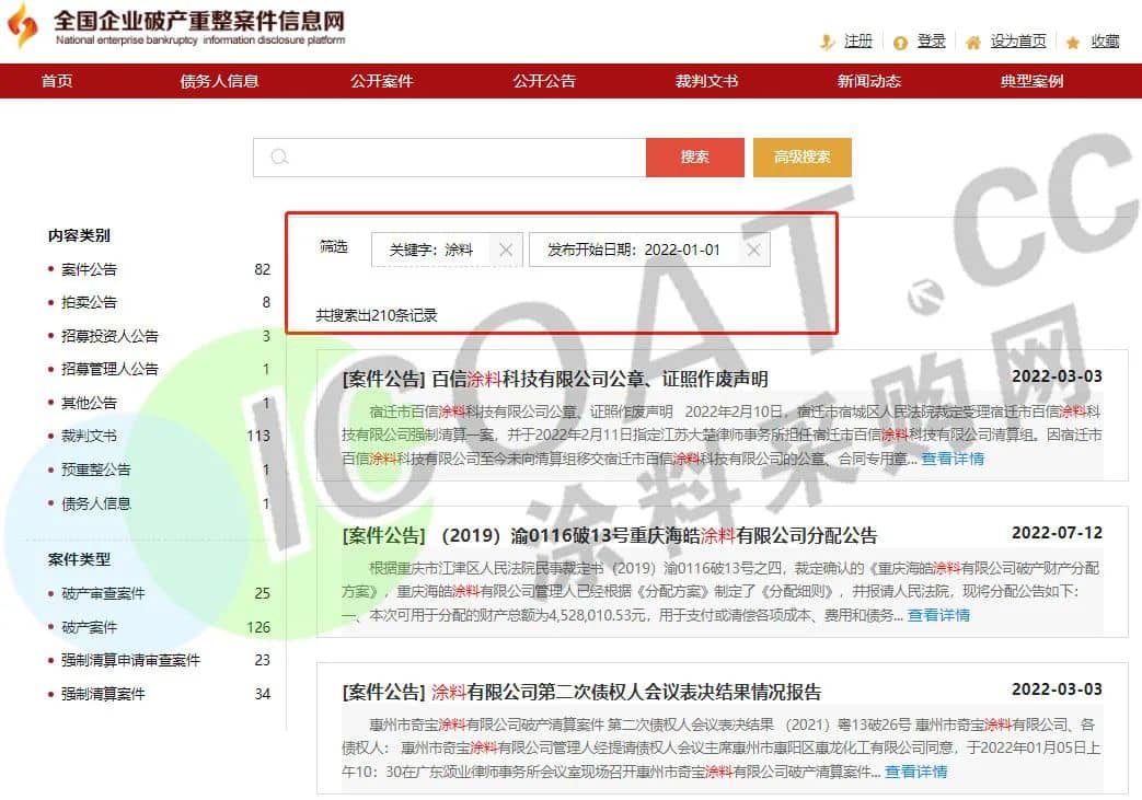 而涉及到涂料企業和相關產業的破產信息高達210條,算下來幾乎每天都有“壞消息”。