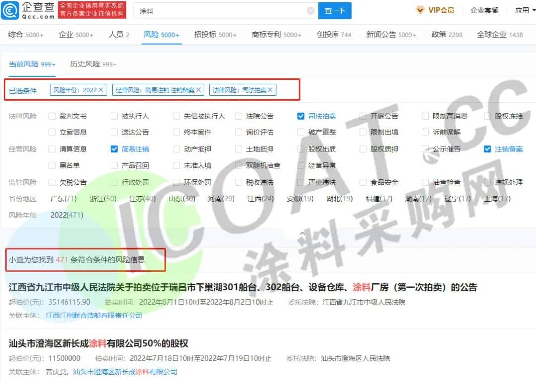 據企查查平臺數據,2022年以來,涂料行業注銷和司法拍賣的企業共471家,分別位于廣東、浙江、山東、江蘇、河南、湖北等多個地區。