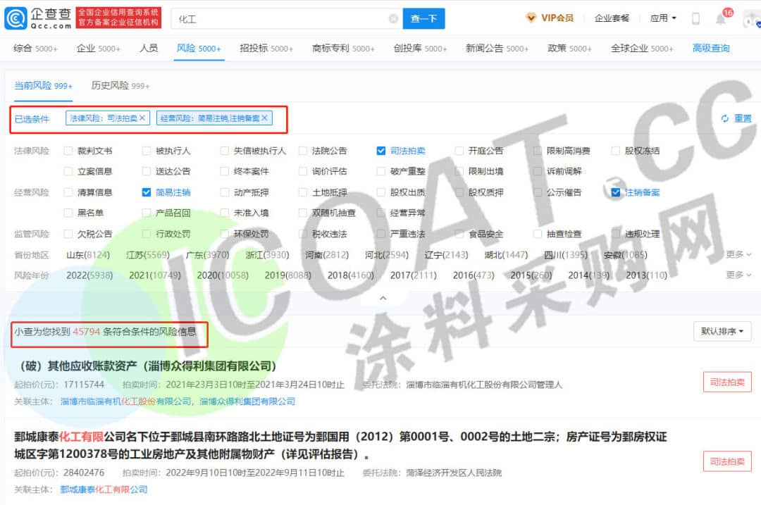 化工企業的數量則更為驚人,2022年以來,化工行業注銷和司法拍賣的企業共45794家,僅在山東、江蘇等地,就超過5000余例。