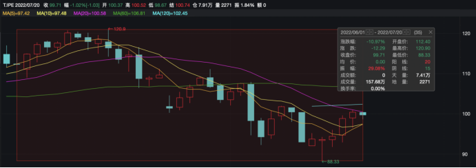 原油方面,國際油價21日大跌,截至當天收盤,紐約商品交易所9月交貨的輕質原油期貨價格下跌3.53美元,收于每桶96.35美元,跌幅為3.53%;9月交貨的倫敦布倫特原油期貨價格下跌3.06美元,收于每桶103.86美元,跌幅為2.86%。WTI原油期貨6月份以來跌幅為11.19%,自7月5日跌破100美元/桶之后,已連日在“100”這一重要心理關口附近徘徊。