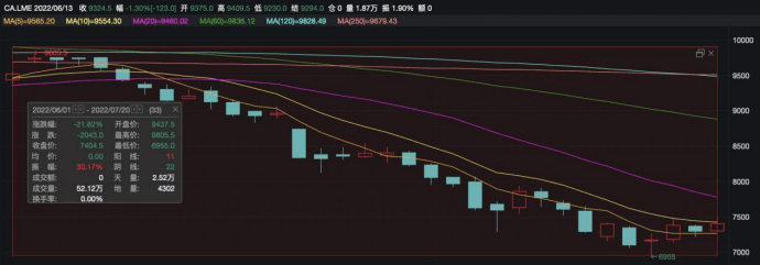 有色市場,6月份以來,有色金屬市場可謂愁云慘淡。截止7月20日,被視為世界經濟晴雨表的倫敦銅價跌幅達到21.67%,觸及2021年初以來的最低水平。與此同時,鋅和鎳下跌21%和23%,鋁和鉑金價格下跌約13%。以整個第二季度計算,LME一籃子最重要的工業金屬的價格跌幅比2008年金融危機以來的任何時候都要大。