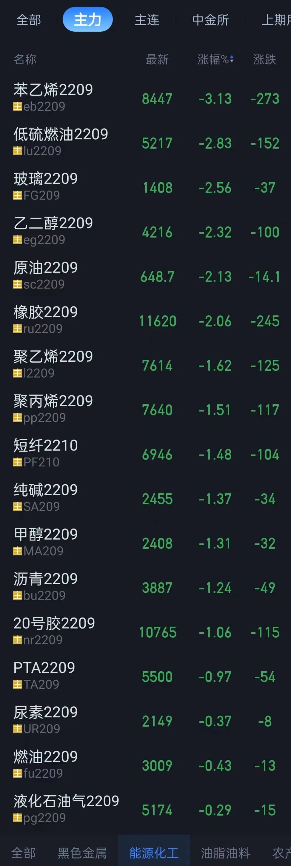 化工市場也出現了較大的變動,22日,國內期貨開盤普跌,棕櫚油跌3%,低硫燃油、苯乙烯、玻璃、乙二醇、SC原油、橡膠跌超2%,PTA、滬錫、焦炭、甲醇跌超1%。