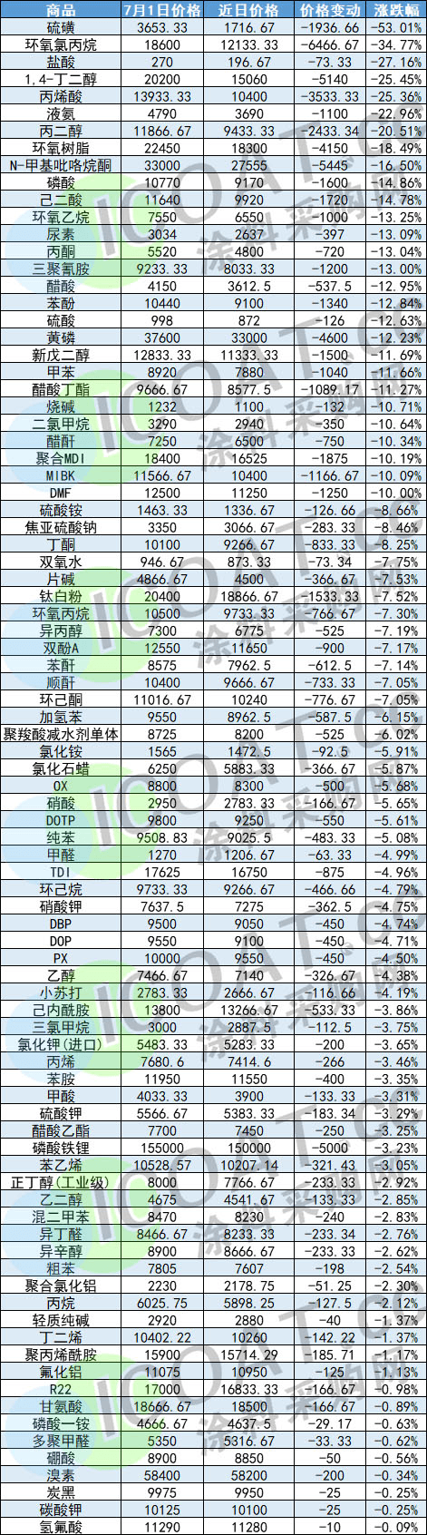 期貨市場的一片飄綠也傳導給現貨市場,80多種化工品價格出現了下滑趨勢,其中環氧氯丙烷、丁二醇、磷酸鐵鋰、黃磷等噸價下跌超千元,部分化工品跌幅近乎腰斬。