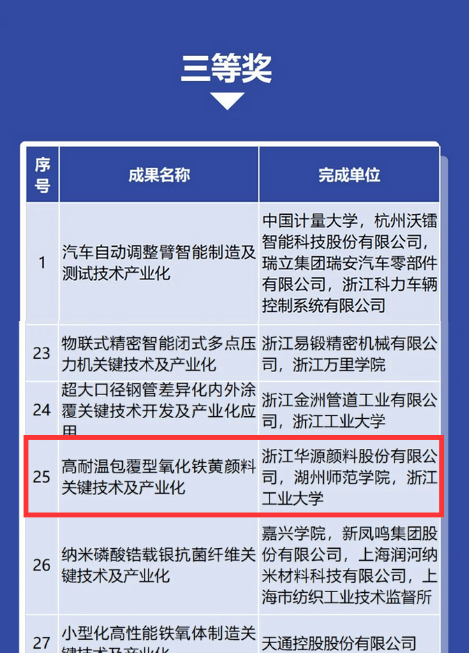 除了提供質量穩定、性能優異的產品,華源顏料還進一步聚焦產業新需求,堅持創新發展戰略,以更多的科技創新成果助力氧化鐵顏料行業快速發展。日前,華源顏料聯合湖州師范學院與浙江工業大學聯合研發的“高耐溫包覆型氧化鐵黃顏料關鍵技術及產業化”項目榮獲了2021年度浙江省科學技術進步獎三等獎。