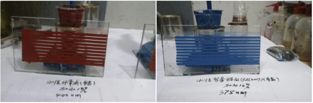涂料采購網(wǎng)在與南方漆業(yè)研發(fā)人員進(jìn)行技術(shù)交流時(shí)獲悉,將水性環(huán)氧底漆加入水性環(huán)氧云鐵中間漆以及水性聚氨酯面漆,經(jīng)過涂裝、靜置后觀察,可以對比得出,不同型號都具備優(yōu)異的抗流掛性效果,極大地提升了涂裝系統(tǒng)的施工性。