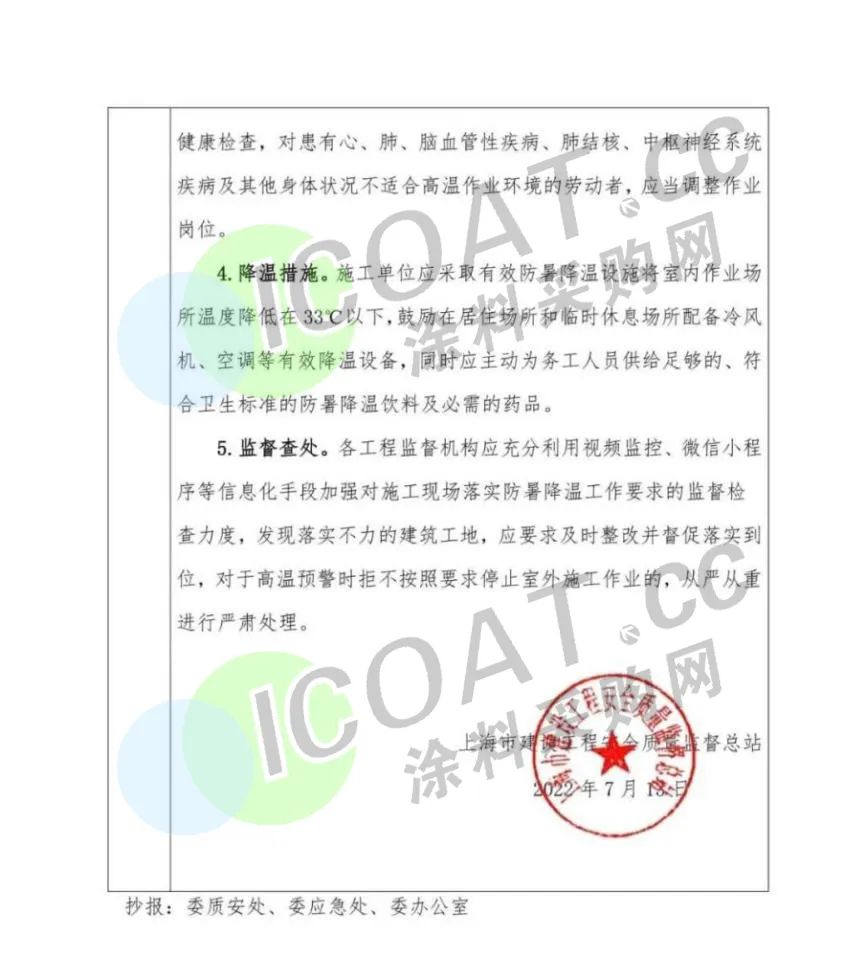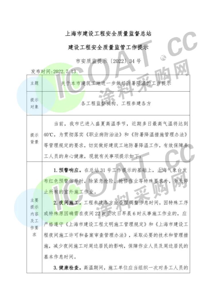 國際大都市上海經歷了長達幾個月的封控后,如今再發“停工”通知。近日,上海市安質監總站發布《關于本市建筑工地進一步做好防暑降溫的工作提示》,通知要求,切實做好建筑工地防暑降溫工作,在總站31號工作提示的基礎上,上海氣象臺發布紅色預警信號時,除緊急搶險、搶修作業等特殊要求外,全天停止所有的室外施工作業。
