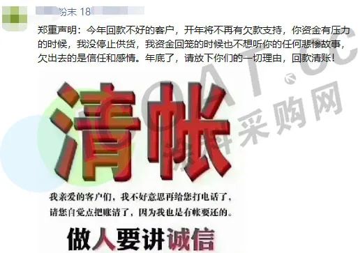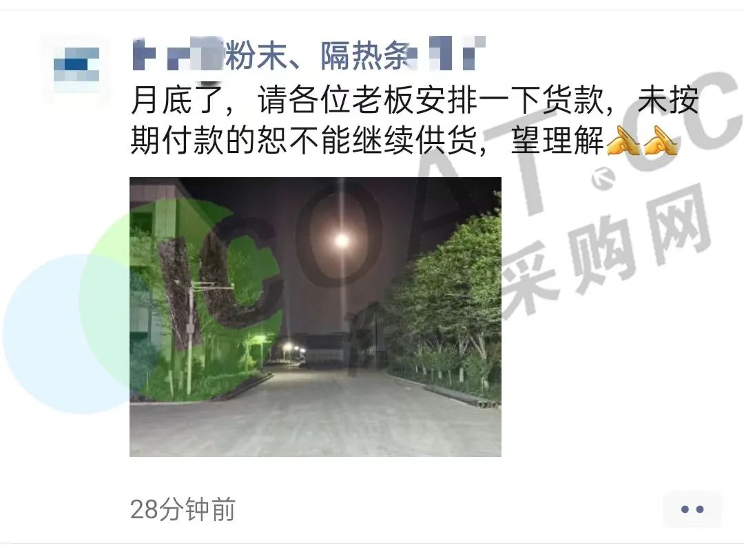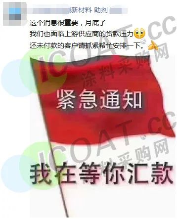 近日,某粉末涂料廠在社交平臺宣布,月底請各位老板安排一下貨款,未按期付款的恕不能繼續(xù)供貨。
