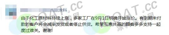 某涂料企業(yè)表示,由于化工原材料持續(xù)上漲,多家工廠在9月1日明確開始漲價,有到期未付款的客戶將會減半發(fā)貨或暫停發(fā)貨。