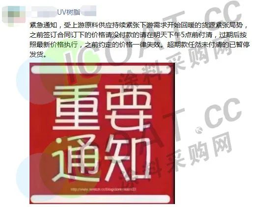 某UV樹脂企業(yè)表示,受上游原料供應持續(xù)緊張和下游需求開始回暖的貨源緊張態(tài)勢,之前簽訂合同定下的價格,沒付款的請在次日下午5點前付清,過期后按最新價格執(zhí)行,之前約定的價格一律失效,超期仍然未付清的已暫停發(fā)貨。