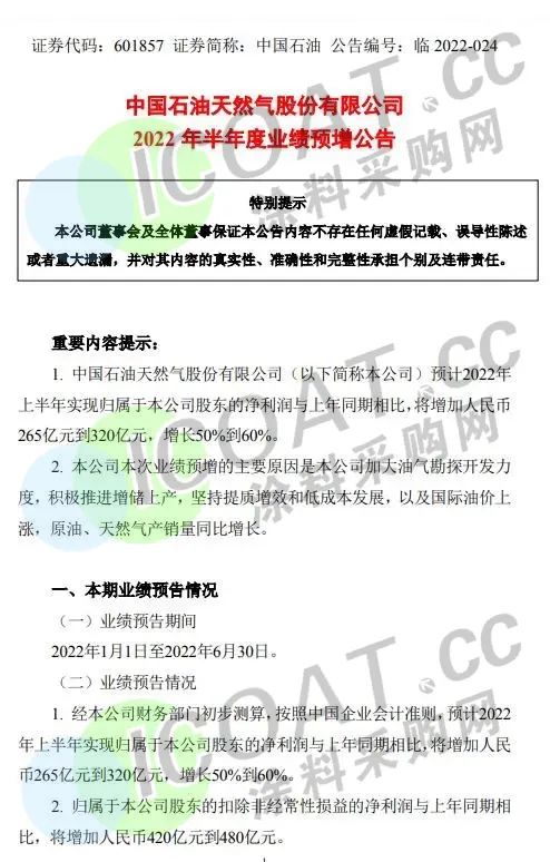 近日,中國石油發布上半年業績預告,預計上半年實現歸屬于本公司股東的凈利潤同比增加265億元-320億元,同比增長50%-60%。中石油表示,將發展新能源新材料作為推動綠色低碳轉型發展的新動能,加快新能源業務發展,到2025年新能源開發利用總量達到2350萬噸標煤,產能占比達到7%。