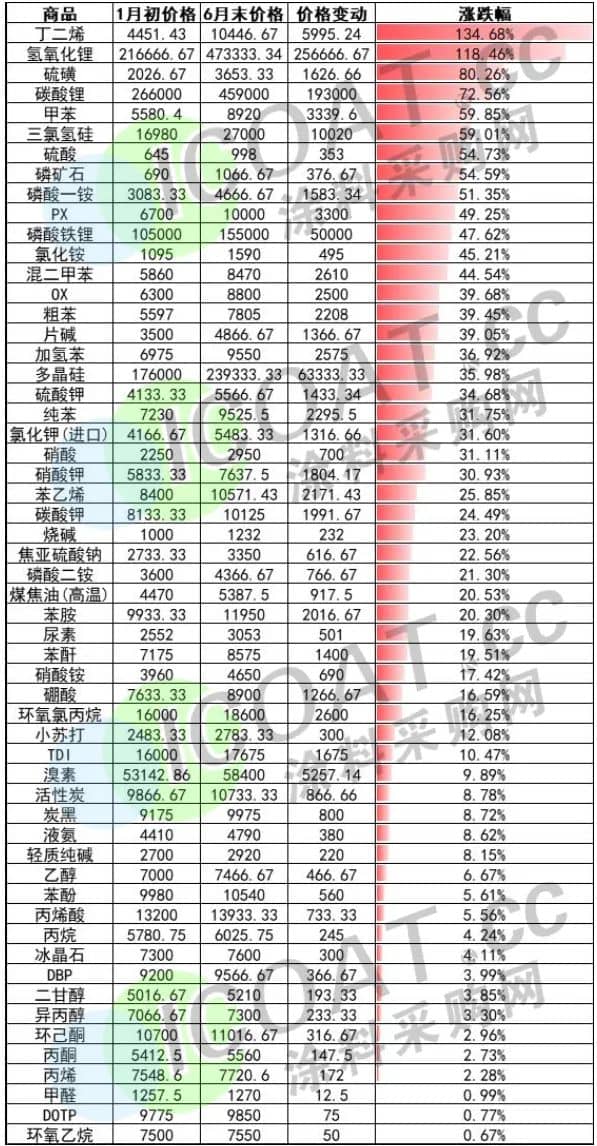 例如光伏產業鏈上的多晶硅、硅片、三氯氫硅、工業硅、氟化工等,以及新能源汽車產業鏈方面的鋰礦、鋰鹽,中游正極材料,磷酸鐵鋰、氫氧化鋰、碳酸鋰等,包括這些產品衍生產業鏈方面的石化、煤化等大宗化工原料等,在上半年均出現了大比例的增長。其中丁二烯、氫氧化鋰等價格翻倍,氫氧化鋰噸價上漲超25萬,碳酸鋰噸價上漲近20萬,這也與上市公司業績預喜形成了完美呼應。