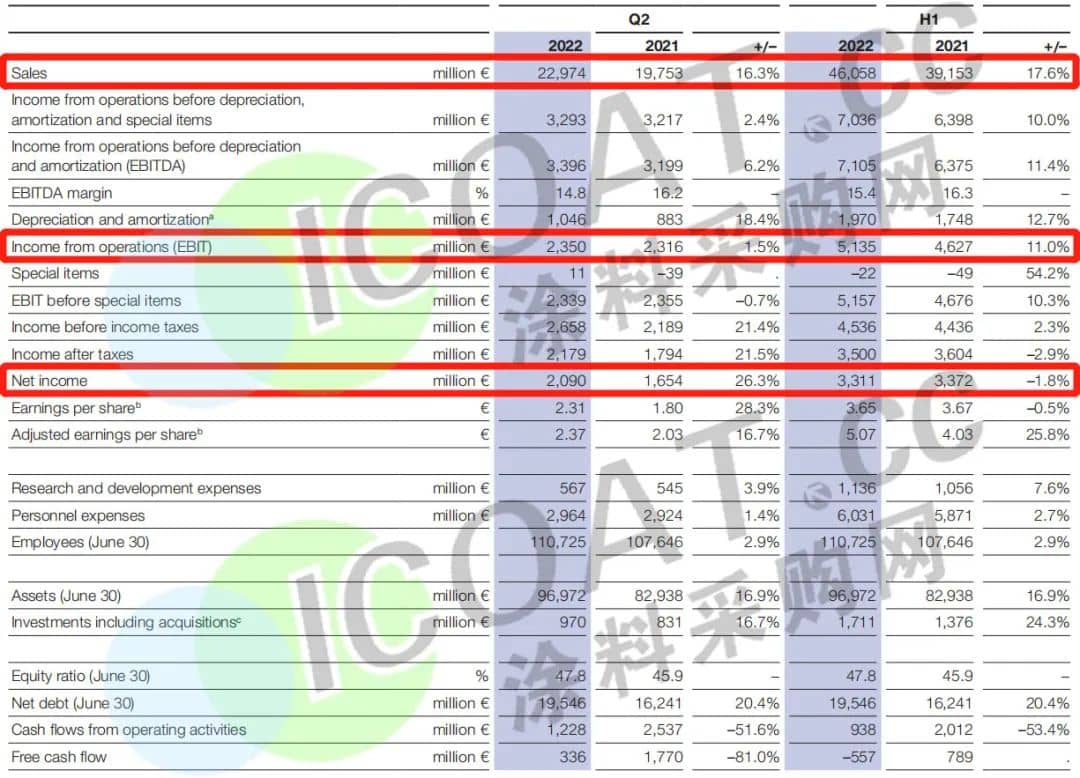 巴斯夫:今年上半年實現銷售額為460.58億歐元(約合人民幣3162.2億元),同比增長17.6%;EBITDA為71.05億歐元,同比增長11.4%;營業利潤為51.35億歐元,同比增長11.0%;不計特殊項目的息稅前利潤51.57億歐元,同比增長10.3%;凈利潤為33.11億歐元(約合人民幣227.32億元),同比下降1.8%。