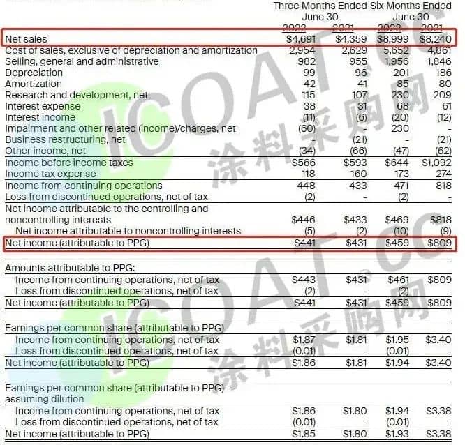 PPG:上半年,PPG實現凈銷售額90億美元(約合人民幣609.78億元),同比增長9%;凈收入為4.6億美元(約合人民幣31.16億元),同比下降43%。