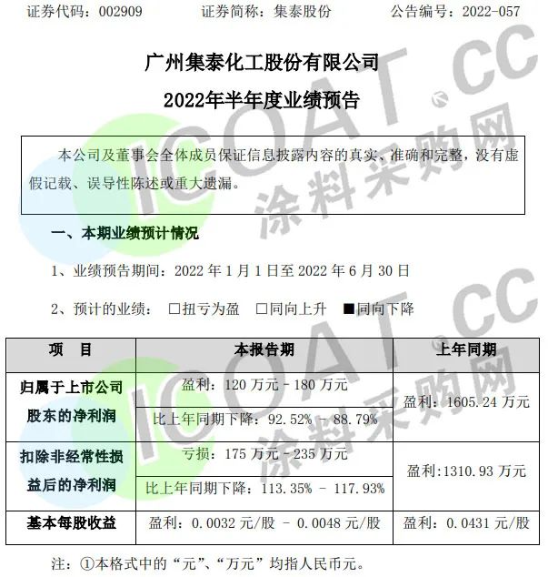 重慶三峽油漆股份有限公司:預計2022年上半年半年度歸母凈利7800萬元-8300萬元,同比增長62.60%-73.02%。