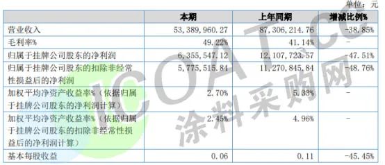 中航新材:發布2022年半年度報告,報告期內公司實現營業收入53,389,960.27元,同比下滑38.85%;歸屬于掛牌公司股東的凈利潤6,355,547.12元,同比下滑47.51%。