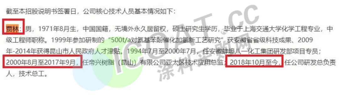 招股書顯示,光華股份研發(fā)工作總負(fù)責(zé)人、技術(shù)總工賈林于2018年10月加入公司,擔(dān)任公司研發(fā)總負(fù)責(zé)人,技術(shù)總工。2000年8月至2017年9月,賈林任帝興樹脂(昆山)有限公司亞太區(qū)技術(shù)應(yīng)用總監(jiān),2017年9月至2018年10月之間沒有顯示有工作履歷。