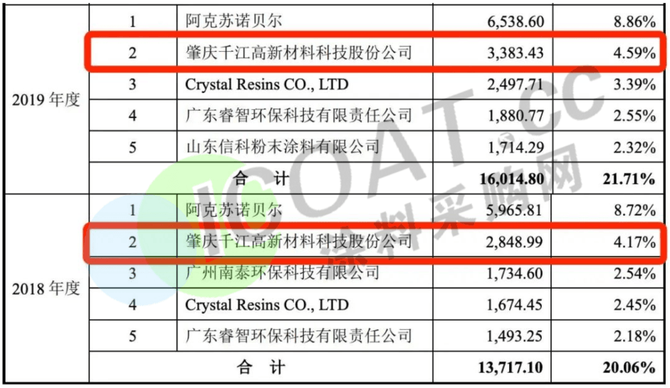 光華科技下游客戶為粉末涂料生產(chǎn)企業(yè),然而卻存在銷售數(shù)據(jù)與客戶采購(gòu)數(shù)據(jù)無(wú)法對(duì)應(yīng)的情況。報(bào)告期內(nèi),新三板公司千江高新為前五大客戶,銷售收入分別為2848.99萬(wàn)元、3383.43萬(wàn)元、2155.73萬(wàn)元、1436.76萬(wàn)元,營(yíng)收占比分別為4.17%、4.59%、2.57%、2.3%。