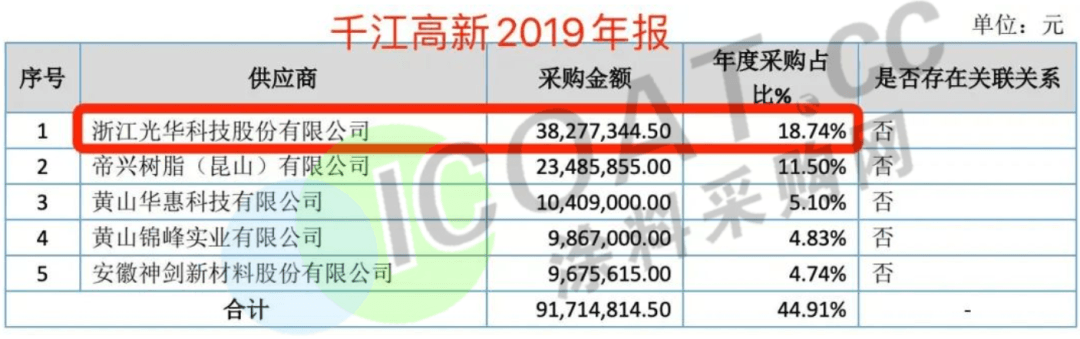 而據(jù)千江高新2018年、2019年財(cái)報(bào),其對(duì)光華科技的采購(gòu)額分別為2783.06萬(wàn)元、3827.73萬(wàn)元,較公司招股書披露數(shù)據(jù)有著百萬(wàn)元差距。