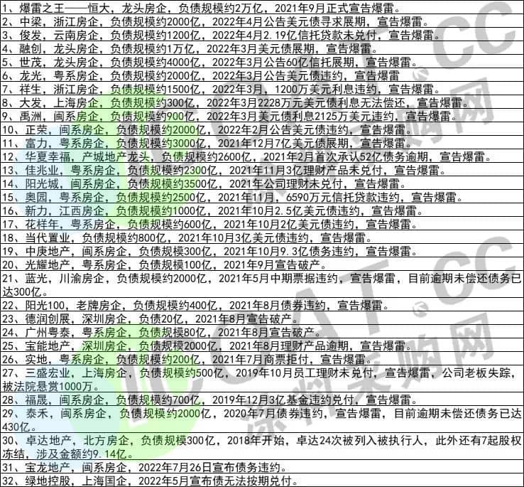 前有恒大集團(tuán)“清算呈請”,后有世茂集團(tuán)“巨額債務(wù)爆雷”,房地產(chǎn)行業(yè)的爆雷和違約已經(jīng)變成了“家常便飯”,多家千億巨頭也被波及。2022年已過半,大多數(shù)房企公司都在收縮、躺平、降價(jià)、回款自救,據(jù)涂料采購網(wǎng)不完全統(tǒng)計(jì),目前已有30多家房企“爆雷”,債務(wù)違約者比比皆是。