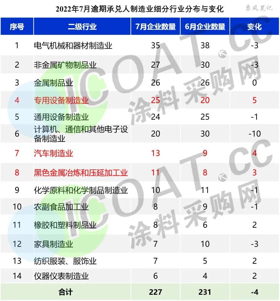 除了房地產(chǎn)之外,制造業(yè)逾期承兌數(shù)量達(dá)到257家,占總逾期數(shù)量的8.26%,也是占比較大的產(chǎn)業(yè)。再進(jìn)一步細(xì)分,汽車制造業(yè)、通用設(shè)備制造業(yè)、化學(xué)原料制造業(yè)數(shù)量均比較驚人,7月逾期數(shù)量分別為13、24、10,占比分別為0.42%、0.77%、0.32%。