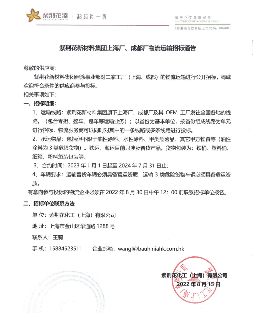 近日,紫荊花涂料(上海)有限公司發布一則招標信息稱,鑒于涂料采購網在行業的影響力,特委托其發布招標信息,對兩家工廠(上海、成都)的對兩家工廠物流運輸進行公開招標,誠邀全國各優秀供應商參與投標。