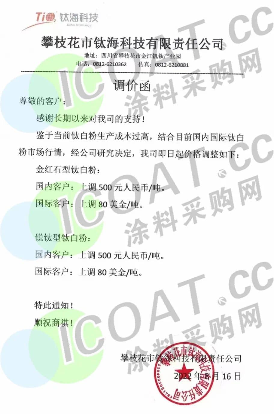 近日,攀枝花市鈦海科技發(fā)布調(diào)價函,稱鑒于當前鈦白粉生產(chǎn)成本過高,結(jié)合目前國內(nèi)國際鈦白粉市場行情,經(jīng)研究決定,即日起價格調(diào)整如下,金紅石型鈦白粉、銳鈦型鈦白粉國內(nèi)客戶上調(diào)500元/噸,國際客戶上調(diào)80美元/噸。