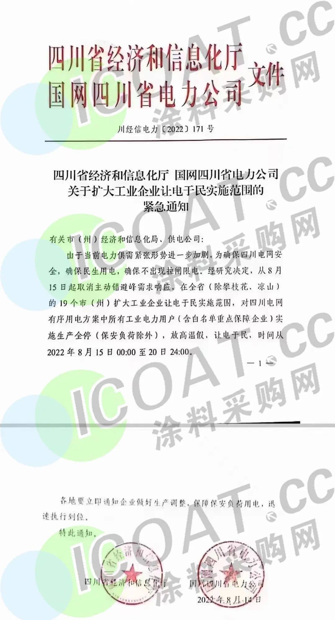近日,四川省經信廳和國網四川聯合下發了《關于擴大工業企業讓電于民實施范圍的緊急通知》,要求從8月15日起,四川?。ǔ手?、涼山)的19個市(州)擴大工業企業讓電于民實施范圍;對四川電網有序用電方案中所有工業電力用戶(含白名單重點保障企業)實施生產全停(保安負荷除外),時間從8月15日零時開始,至8月20日24時結束。