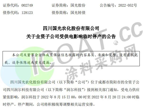 農藥生產企業國光股份:受電力供應緊張影響,其全資子公司潤爾科技將于8月15日零時至8月20日24時臨時停產。