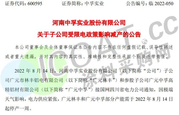鋁業龍頭中孚實業:子公司廣元林豐和參股子公司廣元中孚部分產能需于8月14日起停產一周。預計將影響上述兩家子公司電解鋁產量合計減少1.29萬噸,對應減少凈利潤約0.78億元。