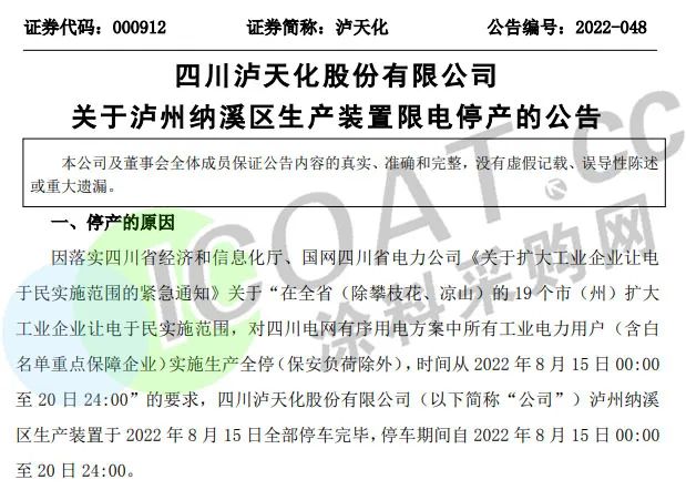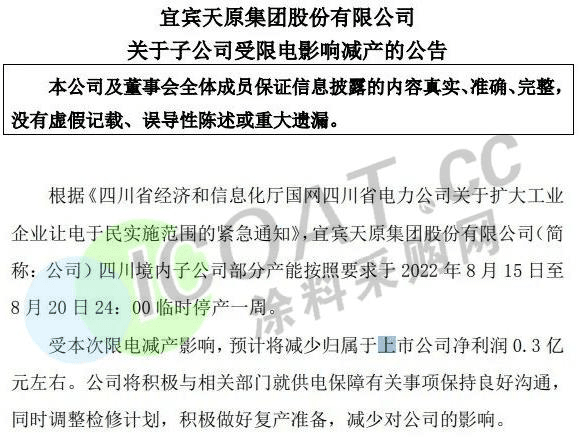 氯堿龍頭天原股份:四川境內子公司部分產能按照要求于2022年8月15日至8月20日24時臨時停產一周。