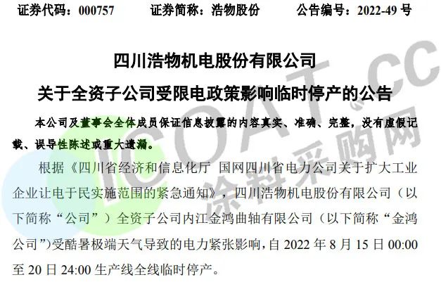 整車銷售龍頭浩物股份:全資子公司內江金鴻曲軸有限公司受酷暑極端天氣導致的電力緊張影響,自8月15日00:00至20日24:00生產線全線臨時停產。