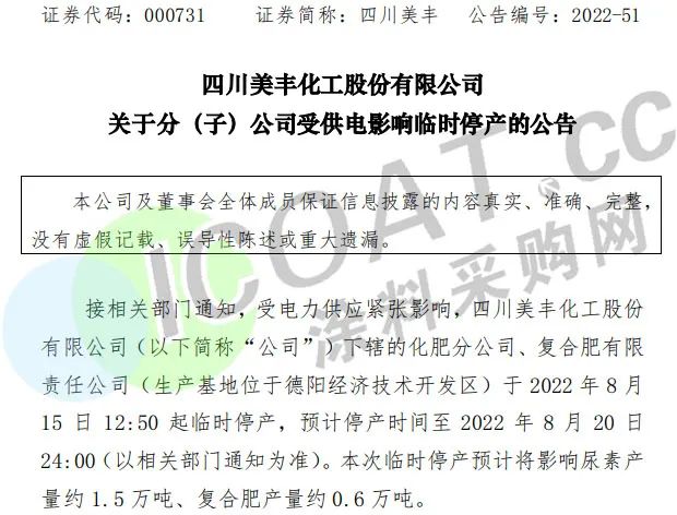 化肥龍頭四川美豐:分(子)公司受供電影響臨時停產,本次臨時停產預計將影響尿素產量約1.5萬噸、復合肥產量約0.6萬噸。