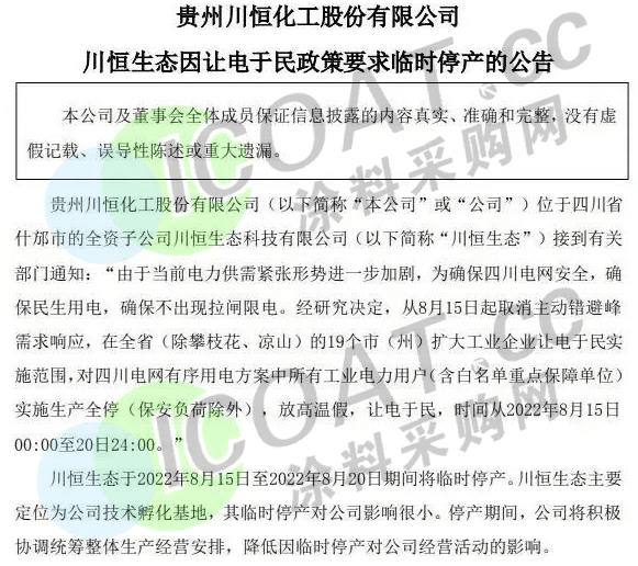 磷礦龍頭川恒股份:位于四川省什邡市的全資子公司川恒生態科技有限公司接到有關部門讓電于民政策要求,于8月15日至8月20日期間將臨時停產。