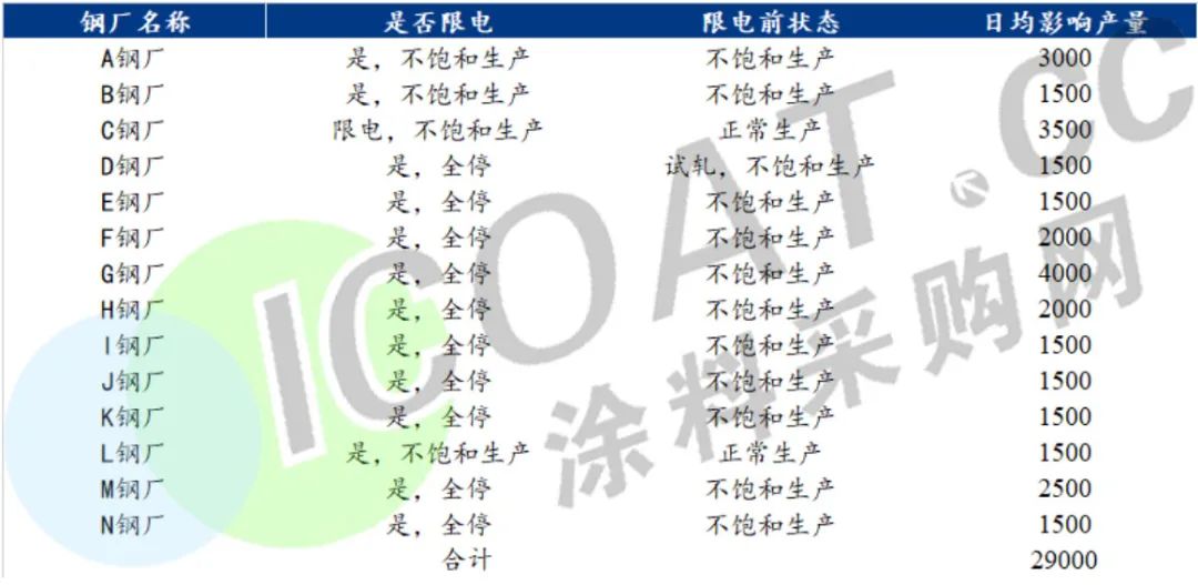 四川電爐鋼廠全部接到通知,11家電爐鋼鐵企業已經開始全部停產,響應讓電于民的政策要求。川內短流程鋼廠基本停產,長流程鋼廠亦錯峰生產,停產比例達71%。此次用電安排方案預計對川內鋼廠生產影響時間為一周左右,預計影響總產量21萬噸。