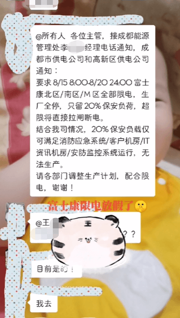成都富士康從15日至20日限電,僅保留20%保安負載,全廠生產停止。生產線員工表示,已接到休息通知。富士康方面回應稱,目前對其運營影響不大。