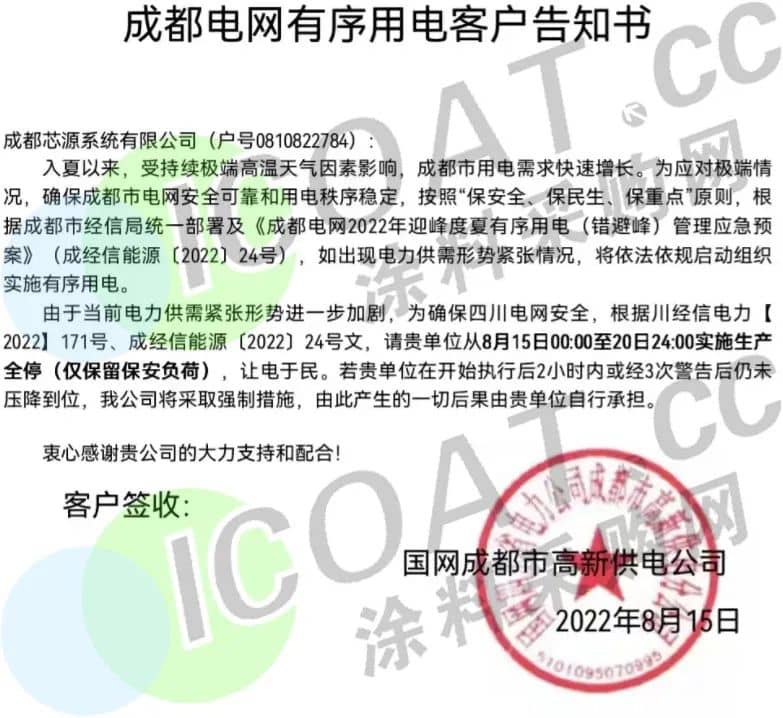 國網成都市高新供電發布《成都電網有序用電客戶告知書》稱,從8月15日起0時至20日24時實施生產全停(僅保留保安負荷)讓電于民。若在開始執行后2小時內或經3次警告后仍未壓降到位,將采取強制措施。
